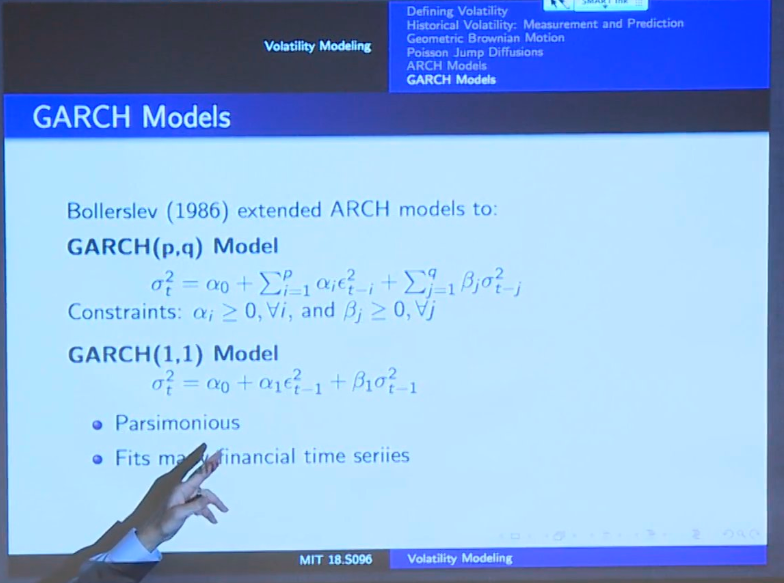 These models estimate future volatility based on past shocks and previous volatility levels.